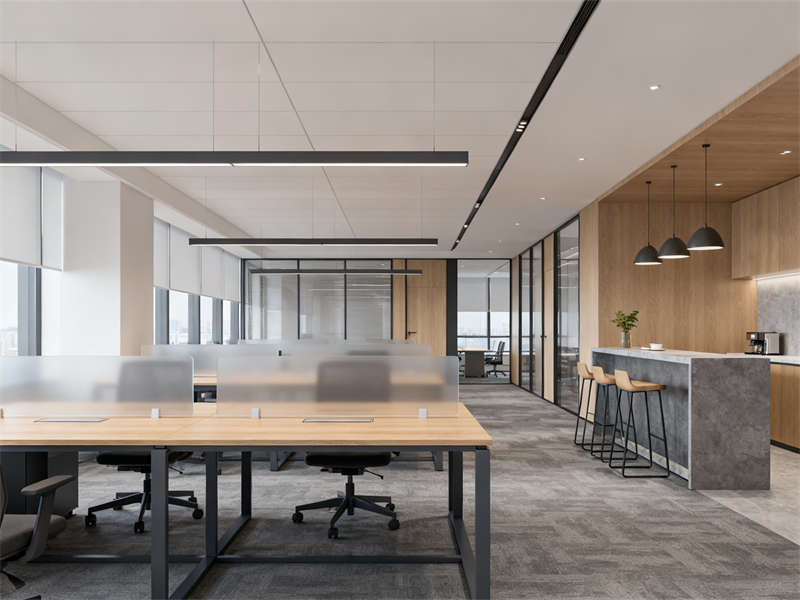 開放辦公區(qū)以通透協(xié)作為設(shè)計重點,半透明磨砂玻璃隔板兼顧隱私與互動,木色桌面與深灰金屬支架結(jié)合,延續(xù)整體材質(zhì)基調(diào),搭配簡約照明,營造專注且不壓抑的工作氛圍。獨立辦公室劃分出辦公與接待區(qū)域,木飾面背景墻搭配淺灰布藝沙發(fā),在保持商務(wù)感的同時,增添柔和質(zhì)感,滿足私密溝通需求。