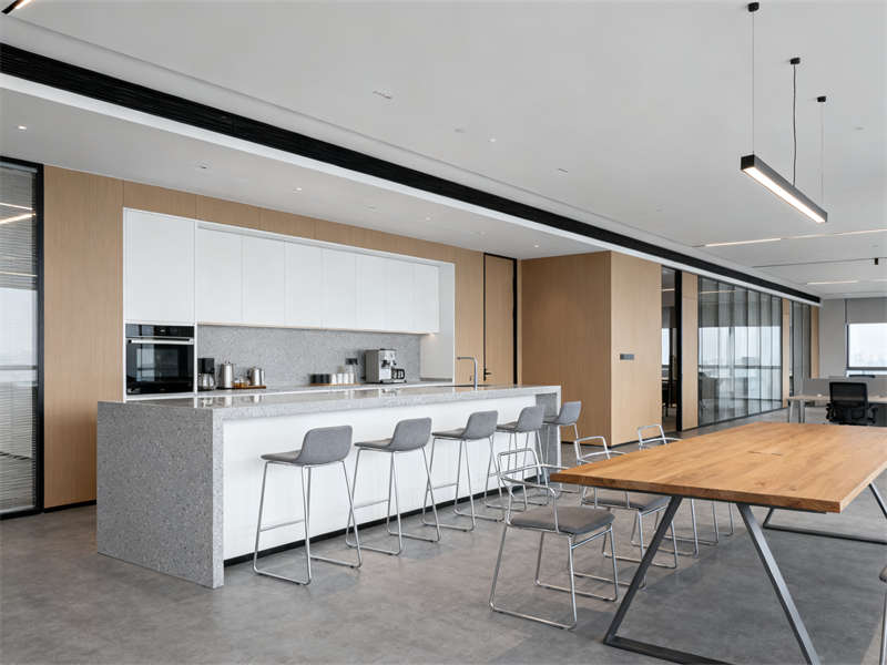 中型會議室圍繞協(xié)作功能展開,長條式會議桌與玻璃隔斷搭配,既保證空間開闊,又能與外部辦公區(qū)形成視覺聯(lián)動,灰色布藝座椅與頂部圓形吊燈呼應(yīng),讓會議場景兼具功能性與舒適感。茶水間則通過淺灰石英石臺面、木色護墻板與暖光燈帶,營造輕松休閑的氛圍,成為辦公間隙的放松節(jié)點。