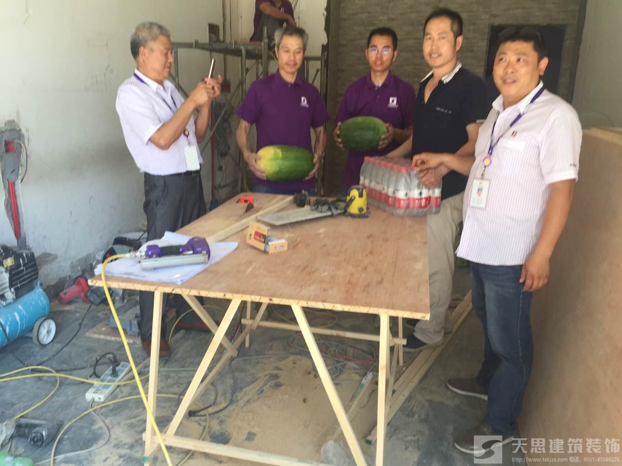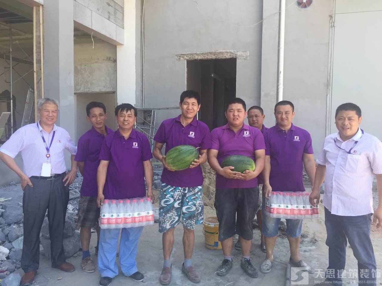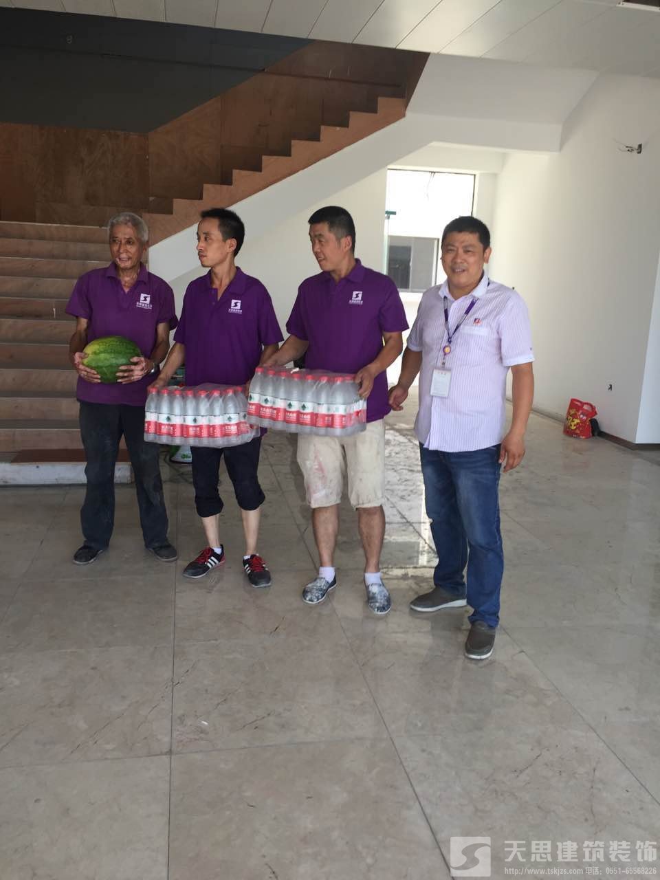 天思建筑裝飾公司為工作在第一線的天思項(xiàng)目經(jīng)理及工人送一點(diǎn)點(diǎn)小小的慰問品,謝謝你們的付出,你們辛苦了。天思一行對大家為趕工期、保質(zhì)量所付出的辛苦表示衷心感謝,并囑咐工地負(fù)責(zé)人要愛護(hù)裝修工人的身體,在保質(zhì)量為首要前提下抓好安全施工。施工盡量利用早、晚時(shí)間,盡量避開高溫時(shí)段;若發(fā)現(xiàn)有身體不適,要及時(shí)注意休息,情況嚴(yán)重的要及時(shí)送醫(yī)。